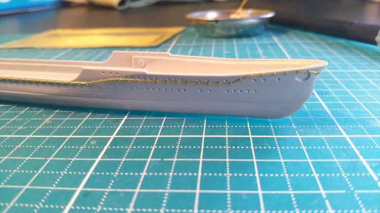取り付けるとこんな感じになりました。艦首の電路取り付けで船体と隙間ができないようにするのに苦労しました・・。