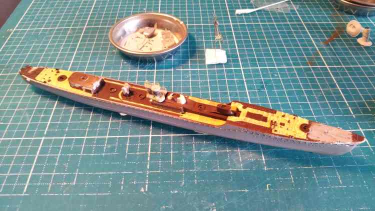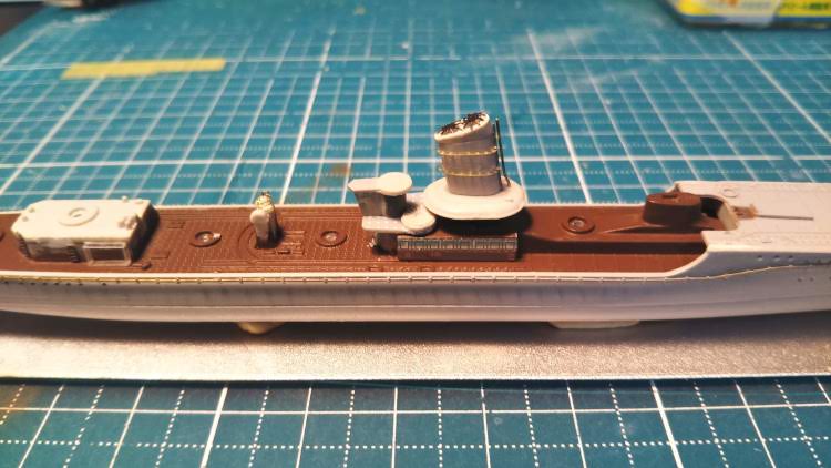 戦艦とか巡洋艦ではめんどくさく感じるマスキングですが駆逐艦だとリノリウム甲板の面積が少ないので楽でした。魚雷運搬用レールの間部分にもリノリウムが施されていたらしく、マスキングするのが大変でした。(なんでそんな所にリノリウム貼ってんだよー!!)