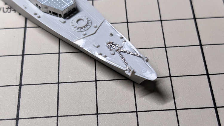 ホーサーリールや錨鎖、フェアリーダーを切断しました。キットの艦船装備セットのランナーについてる錨と市販のチェーンで加工。