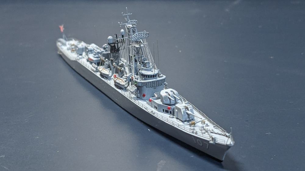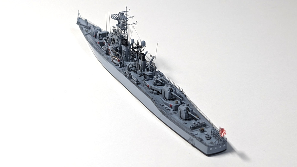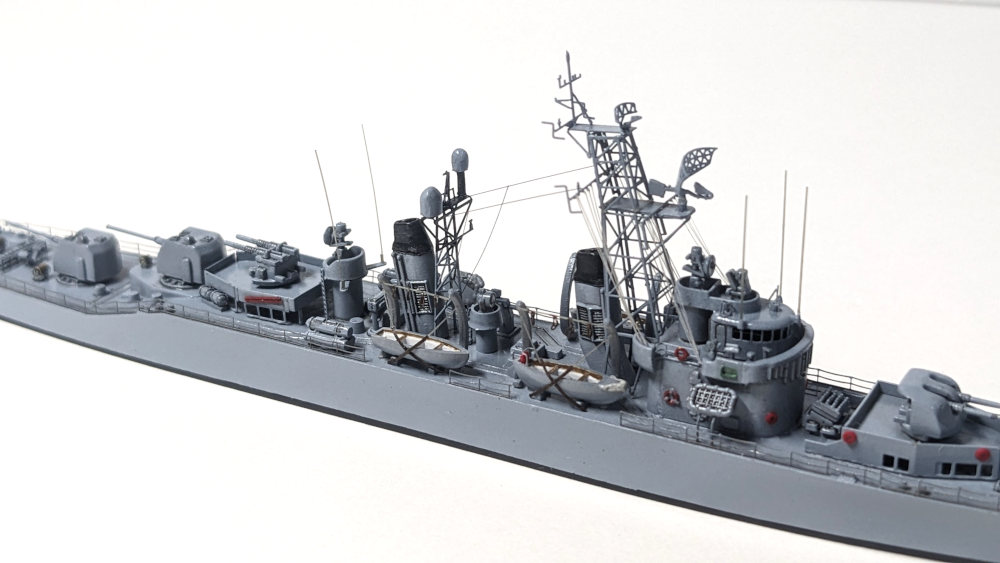 手すりもつけて、スミ入れもして、伸ばしランナーでアンテナとかもつけて、さあ完成!(手すりは帝国海軍用のエッチングパーツ)