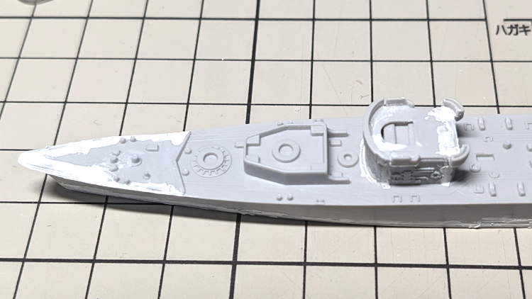 船体の元々のブルワークを切り離したらその部分が穴になってます。完成後に隙間からその穴が見えてしまうのは変なのでパテで埋めました。