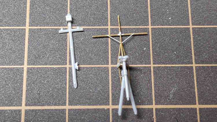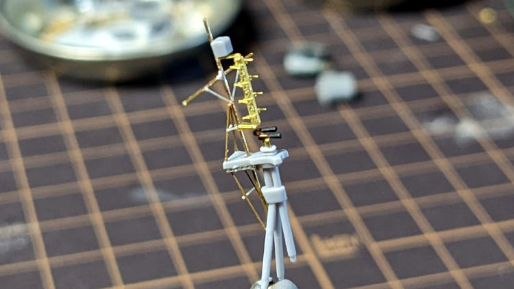 後部マストは先端部や横方向の部分を真鍮線に。そしてはしごもつけています。