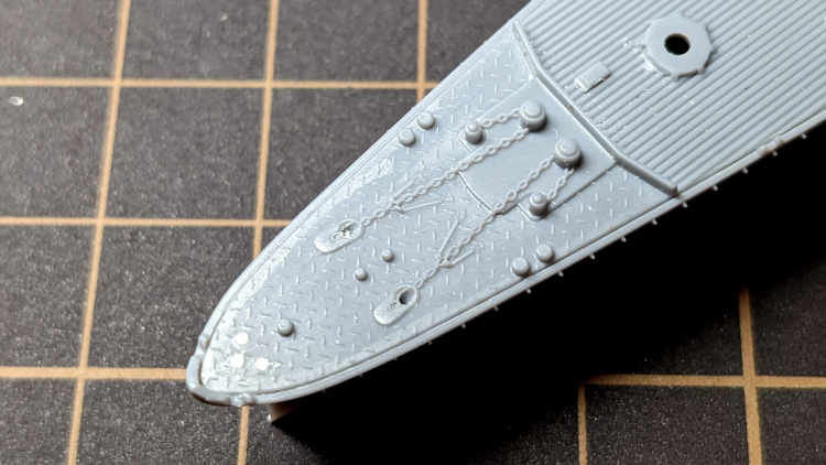 甲板部分は艦首部分に手を加えています。艦首旗竿用の穴を埋めて(いつも真鍮線で旗竿を作るので)、錨鎖を置き換えます。艦首以外は木甲板シートで覆うので特に触っていません。