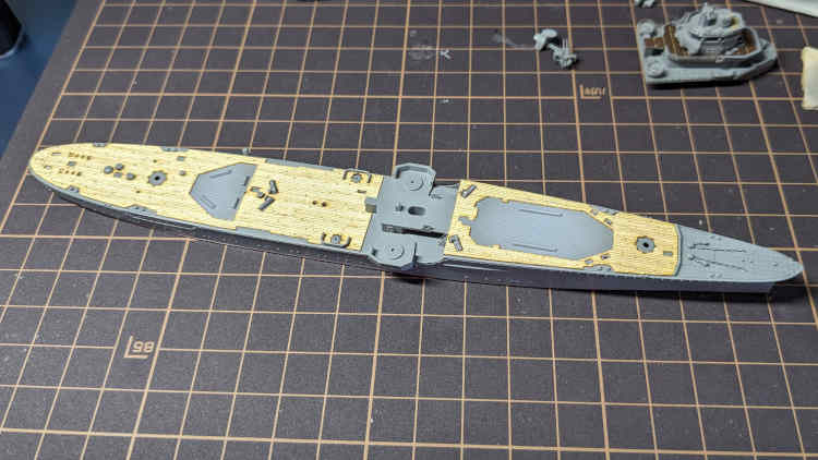 ↑後々の写真。船体にグレーを吹いてその上に甲板シートを貼りました。シートはところどころはまりが悪かったりして上手く当てはめるのに少し苦労しました。