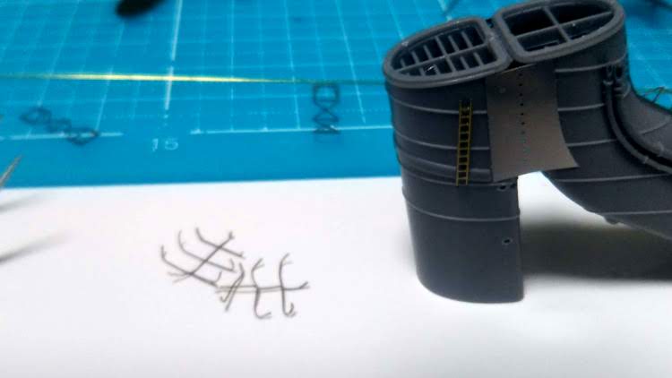 煙突のファンネルキャップは取り付けが上手くいかず、何回もやり直すうちに曲がってしまいました・・・。しょうがないので0.5㎜の真鍮線を組み合わせてそれっぽいファンネルキャップを作りました。