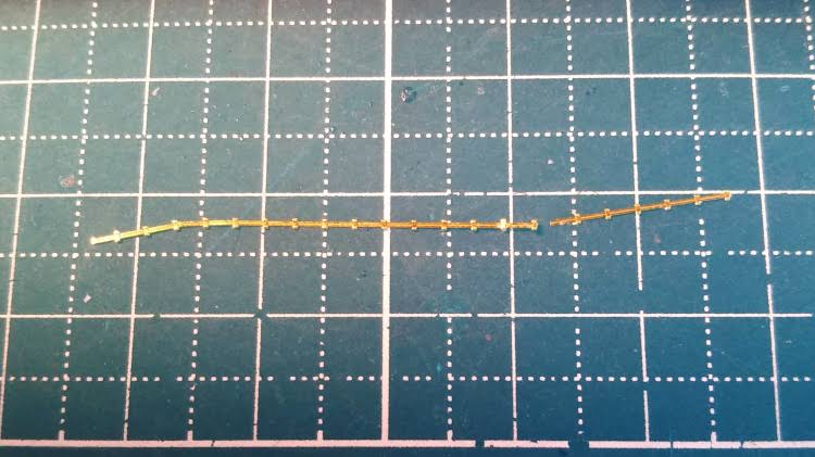 暁の舷外電路ですが、艦の前方部分は何か所か電路を曲げて取り付けないといけないところがありました。↑写真のような感じで形を作ってから接着しました。