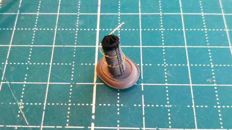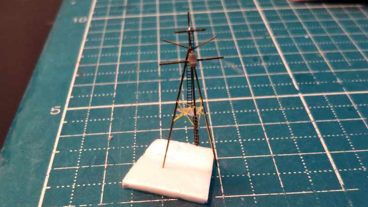 三脚の部分は0.3㎜で、0.2㎜の真鍮線を張り出してる部分に使いました。見張り台はキットのものを、"✕"の部分は0.1㎜ぐらいの細さの伸ばしランナーで作っています。デティールアップで梯子をつけています。