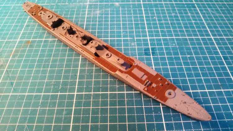 戦艦とか巡洋艦ではめんどくさく感じるマスキングですが駆逐艦だとリノリウム甲板の面積が少ないので楽でした。魚雷運搬用レールの間部分にもリノリウムが施されていたらしく、マスキングするのが大変でした。(なんでそんな所にリノリウム貼ってんだよー!!)