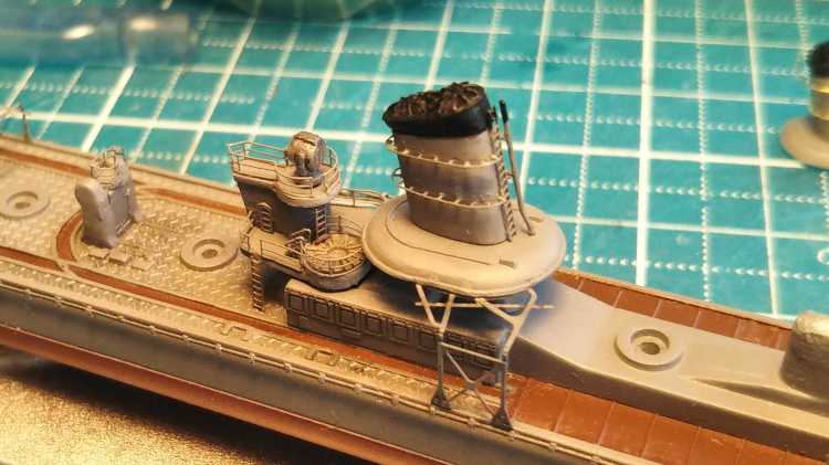 こんな感じでできました。ジャンクパーツ等で作りましたが割と上出来なんじゃないですかね(笑)。この部分を自分で作りなおしたせいで、第二煙突の基部が干渉しちゃいました。なので干渉した分だけ削って、エポパテで削った分前に付け足して位置をずらしました。
