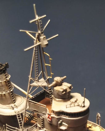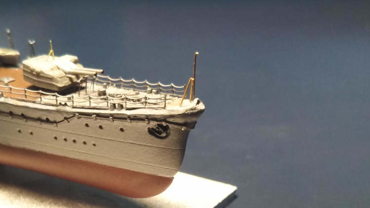 艦首旗竿。0.2mmの真鍮線で。先っちょを少し曲げるのがミソ。