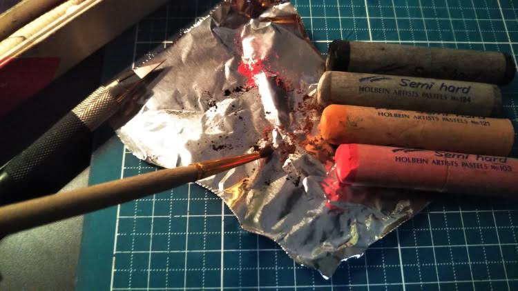 甲板シートはプラスチックではないので、塗料を使わずにパステルカラー(チョークに似た画材)を使いました。黒、灰、黄土、赤のパステルを使って戦闘の爆炎などで汚れた感じを出してみました。