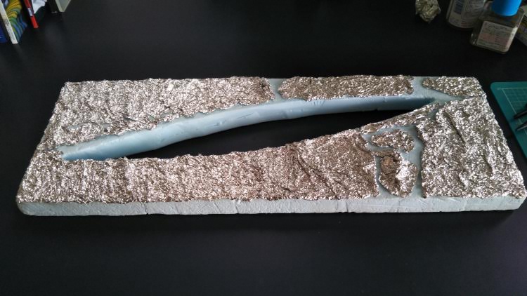 まず、船体の形に発泡スチロールを切り抜いた後、海面の凹凸を出すためにアルミホイルをわしゃわしゃして貼り付けました。