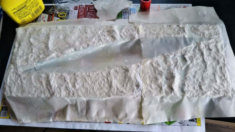 その後アルミホイルの上に和紙を湿らせた和紙をボンドで貼り付けました。別に和紙じゃなくてもよかったと思うのですが僕はアクリル絵の具で海面を塗ろうとしたのでこのようにしました。なんでアクリル絵の具を使いたかったんでしょうね、よくわかんないです。(ラッカー塗料とかで塗るなら和紙じゃなくてアルミホイルをかぶせてその上に色を塗るので良いと思います。)