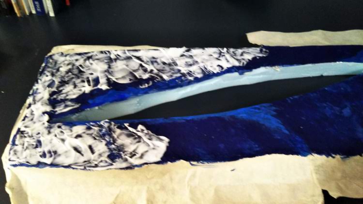 そして、主にプルシアンブルーの絵具で色を付けた後、波を表現するためにメディウムを塗っています。平筆で塗っていくといい感じにできます。