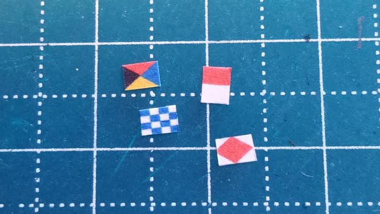 手元に図形を好きに組み合わせたりできるソフトがOfficeぐらいしかなかったのでパワポを使って大体の信号旗を作りました。3×2mmの大きさでコピー用紙に裏表印刷しています。