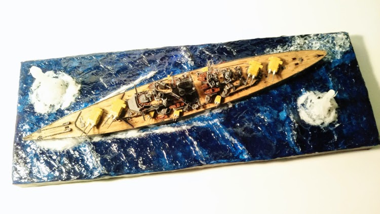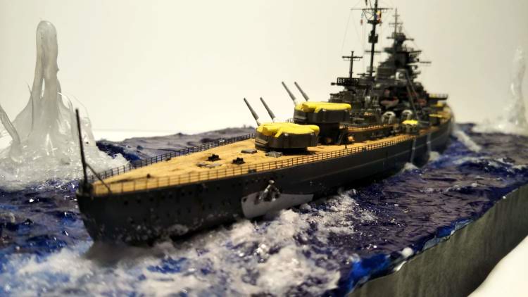 以上で基本の海面は完了です。最後に、ビスマルクを当てはめて走行波と航跡、そして戦闘シーンにしたかったので至近弾の水柱を表現しました。艦首の波しぶきは綿とメディウムで作りました。また機会があれば詳しく紹介したいです。