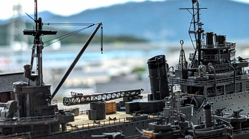 後方からの中央部と艦橋あたりの画がイチ押しです!クレーンのワイヤーはエッチングパーツです!1945年の姿なので木材も積んでいます。プラ棒を重ねて、糸を巻いて表現しています。