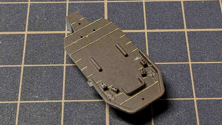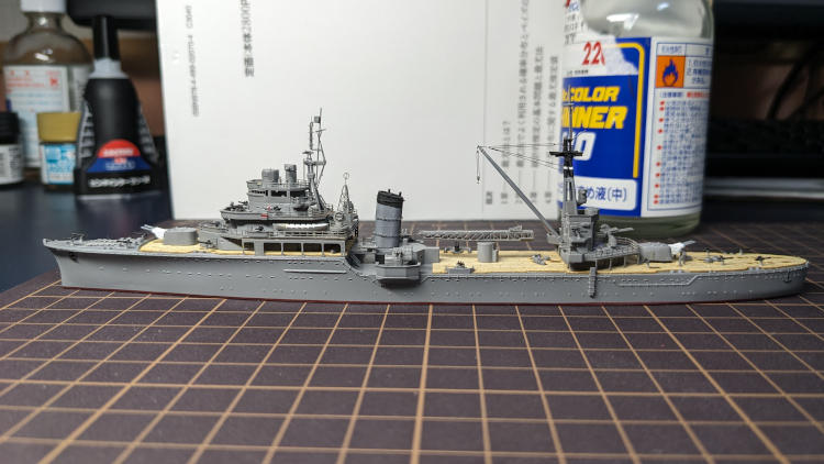 ↑後々の写真。船体にグレーを吹いてその上に甲板シートを貼りました。シートはところどころはまりが悪かったりして上手く当てはめるのに少し苦労しました。