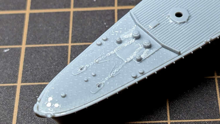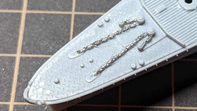 甲板部分は艦首部分に手を加えています。艦首旗竿用の穴を埋めて(いつも真鍮線で旗竿を作るので)、錨鎖を置き換えます。艦首以外は木甲板シートで覆うので特に触っていません。