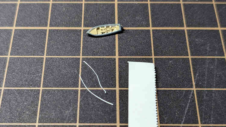 艦載艇のとりつけ。たすき部分はレシートを薄く切って表現。