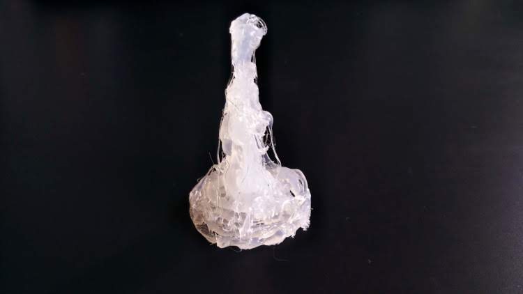 次に中心部分を高く盛り上げていきます。その際まずある程度の量、溶かしたスティックを出し、フタごと反対に向けて重力の重みで水柱部分を伸ばしていきます。ほっとくと伸びすぎて細くなるのである程度のところで風などを送って冷ましましてください。